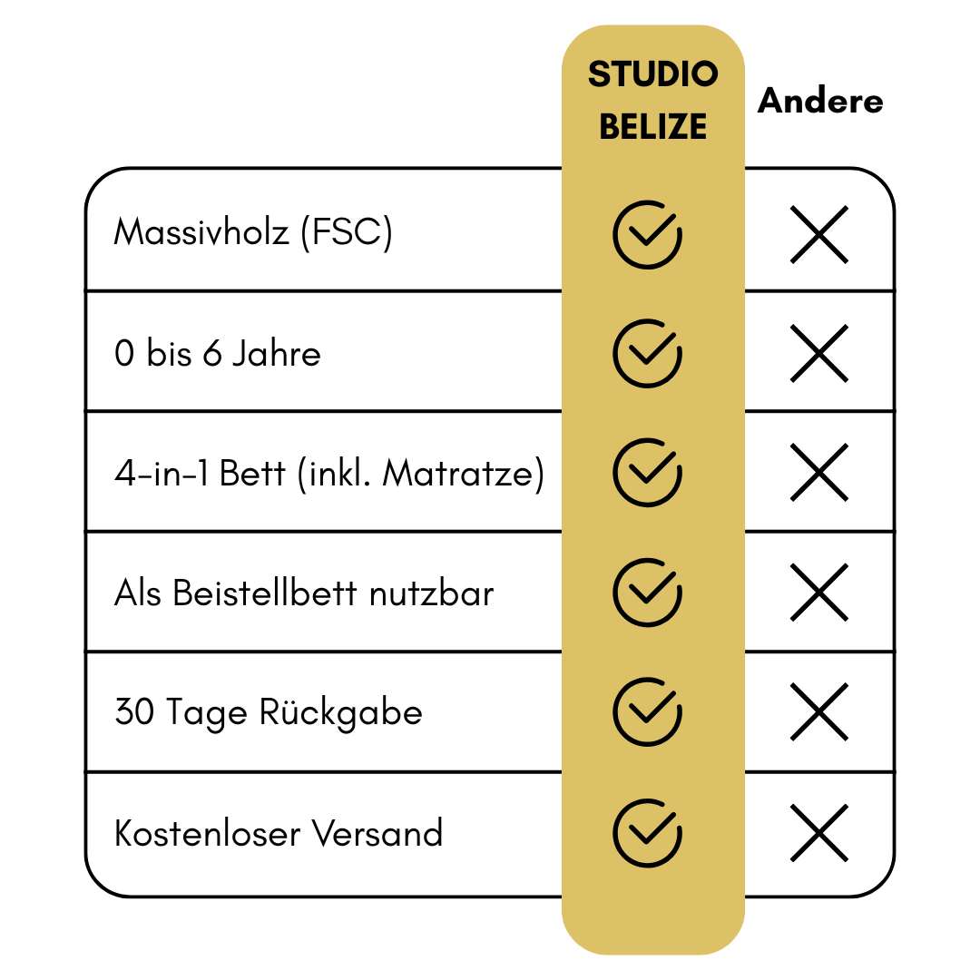 Il lettino per bambini in crescita dello Studio Belize® nella Wood Edition. Accompagna il bambino dalla nascita ai 6 anni. Versatile e trasformabile: culla, letto aggiuntivo, letto per bambini, divano per bambini o letto junior.